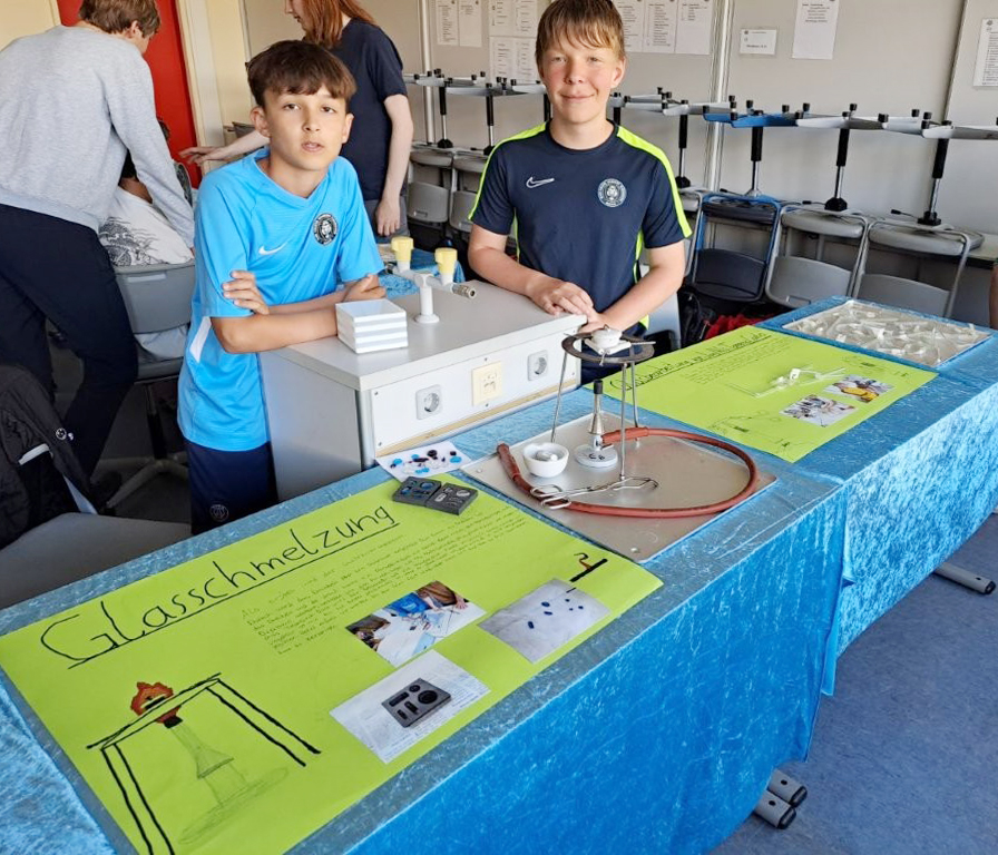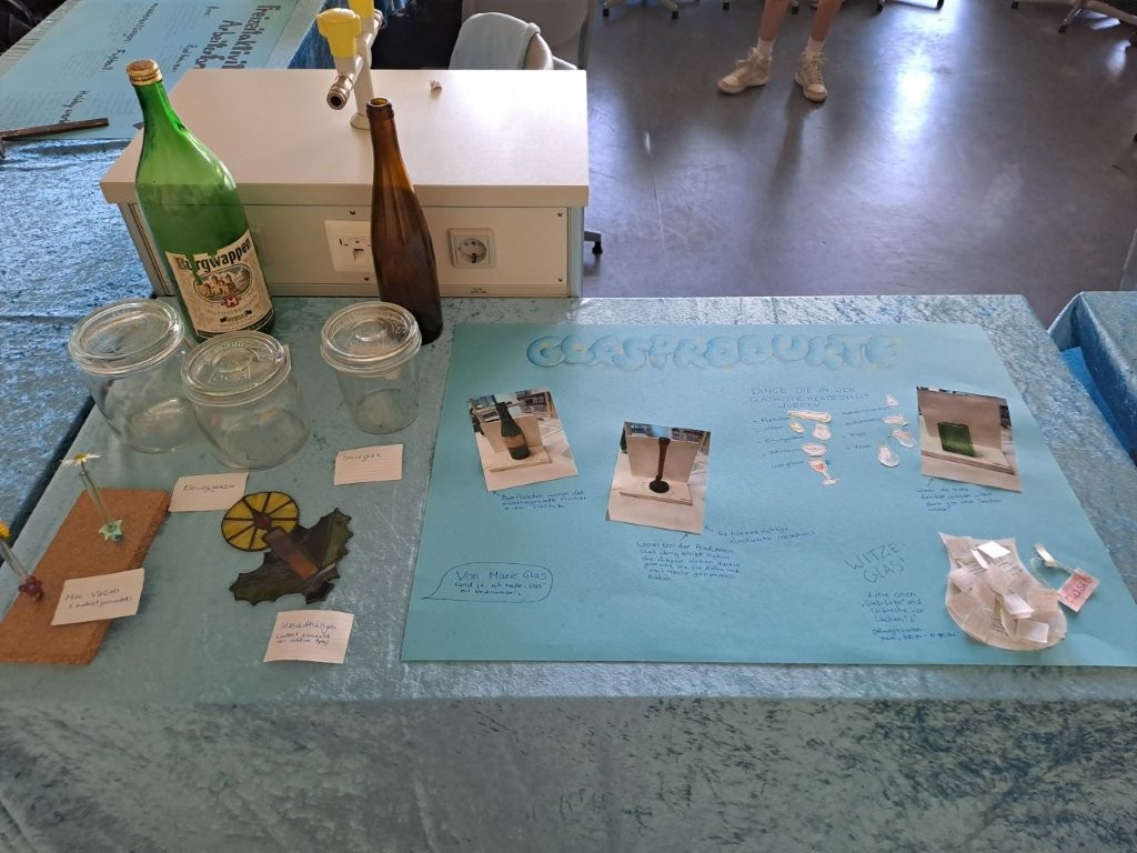 Zu Themen wie der Chemie des Glases, Wohnen und Umgebung der Glashütte, Standortfaktoren und Transportwege, Leben der Arbeiter, Glasherstellung und -bearbeitung, Glasprodukte teilte sich das Team in Gruppen auf. Mit Recherchen, Plakatgestaltungen und 3D-Modelldrucken präsentierte es in einer Abschlussausstellung, welche Erkenntnisse über die eigene Stadt und den Werkstoff Glas die Projektwoche zutage fördern konnte. In einem Schaukasten der Schule werden die Projektergebnisse einen festen Platz finden.