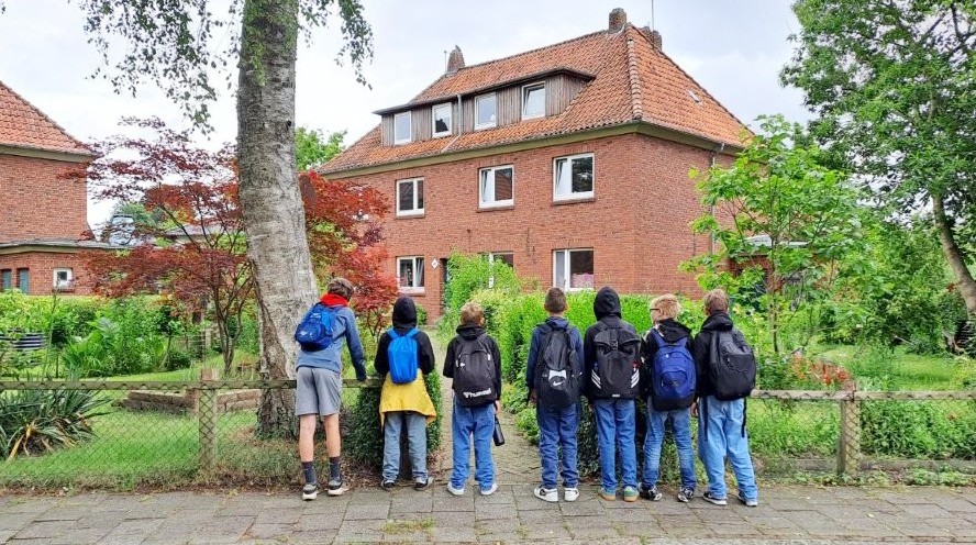 Angeleitet durch die Lehrkräfte Dr. Bernhard Sturm und Annette Blau machte sich das Team gleich am ersten Tag auf ins Glashüttenviertel. Die ehemaligen Werkssiedlungen Sansibar und Roter Strumpf sind nahezu aus dem Stadtbild verschwunden, doch die Siedlungen Kamerun und Breslauer Straße (s. Bild oben) stehen unter Denkmalschutz. Errichtet von1928 bis Mitte der 30er Jahre, boten die Häuser auch Ställe für Tiere und Gärten, aus denen sich die Menschen selbst versorgen konnten. Die Sanierung der Siedlung Breslauer Straße, eines der raren Denkmäler der Arbeitergeschichte in Oldenburg und erhaltenswertes Zeugnis sozialer Bau- und Wohnkultur, wurde vor einigen Jahren von der Deutschen Stiftung Denkmalschutz gefördert.