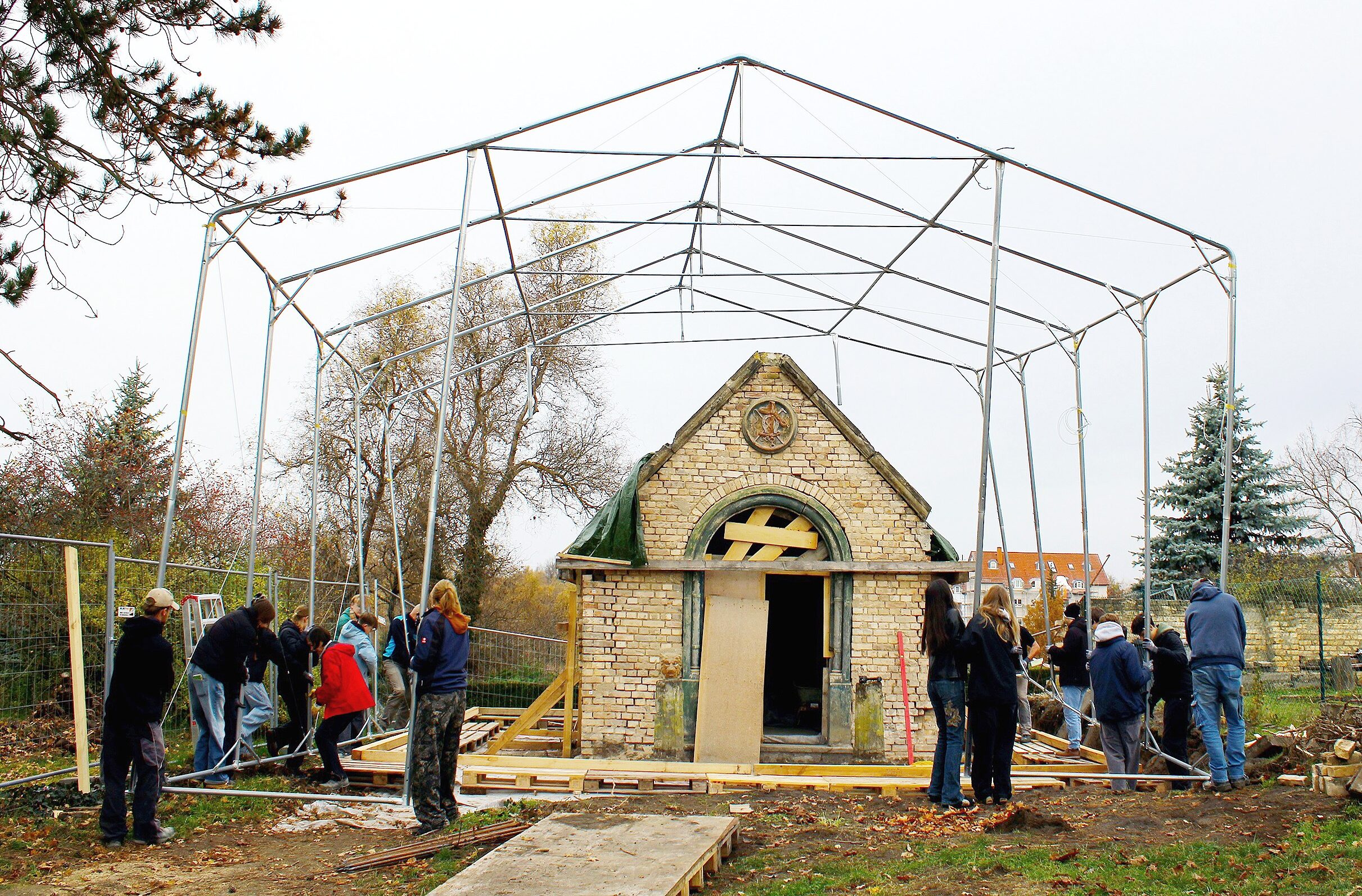 Das Projekt­team hilft Handwer­kern der Bauhütte Quedlin­burg bei der Errich­tung der Einhau­sung für das Mauso­leum. (Fotos: Louisa Tiede, Halle)