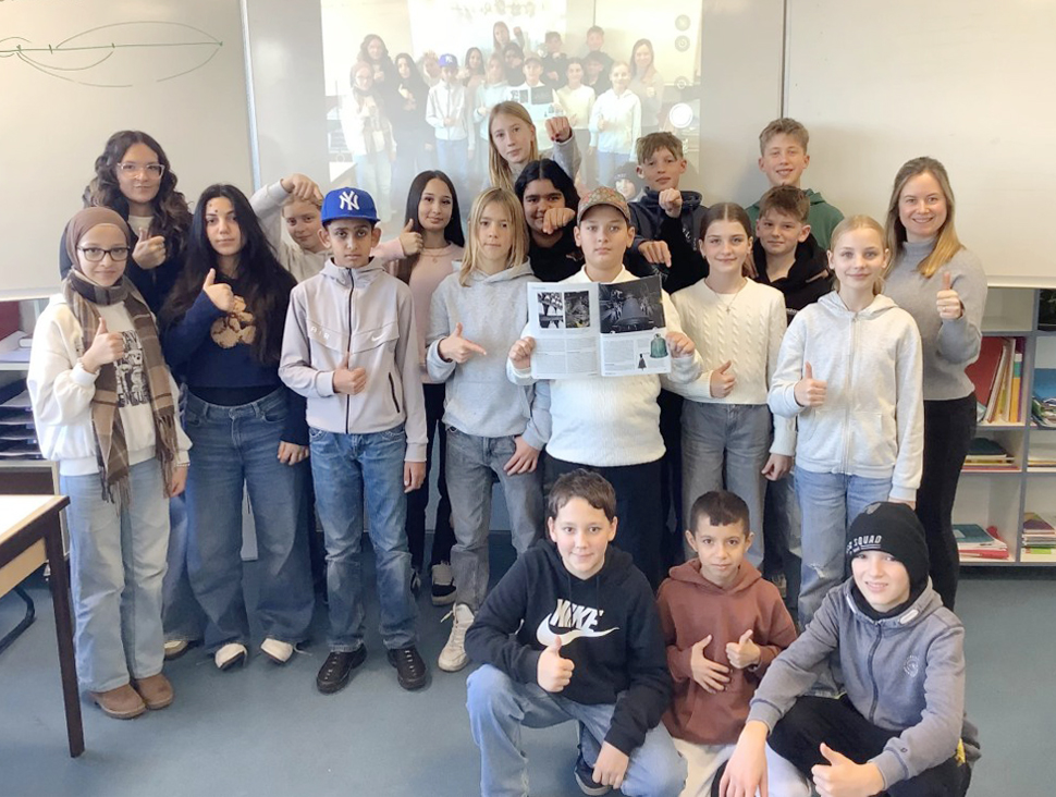 Das Projekt­team der Klasse 7b freut sich über die Würdi­gung des Glocken-Projekts aus dem Vorjahr in Monumente, der Zeitschrift der Deutschen Stiftung Denkmal­schutz. (Link zum Bericht auf der Schul­home­page / Foto: J. Hinte­mann)