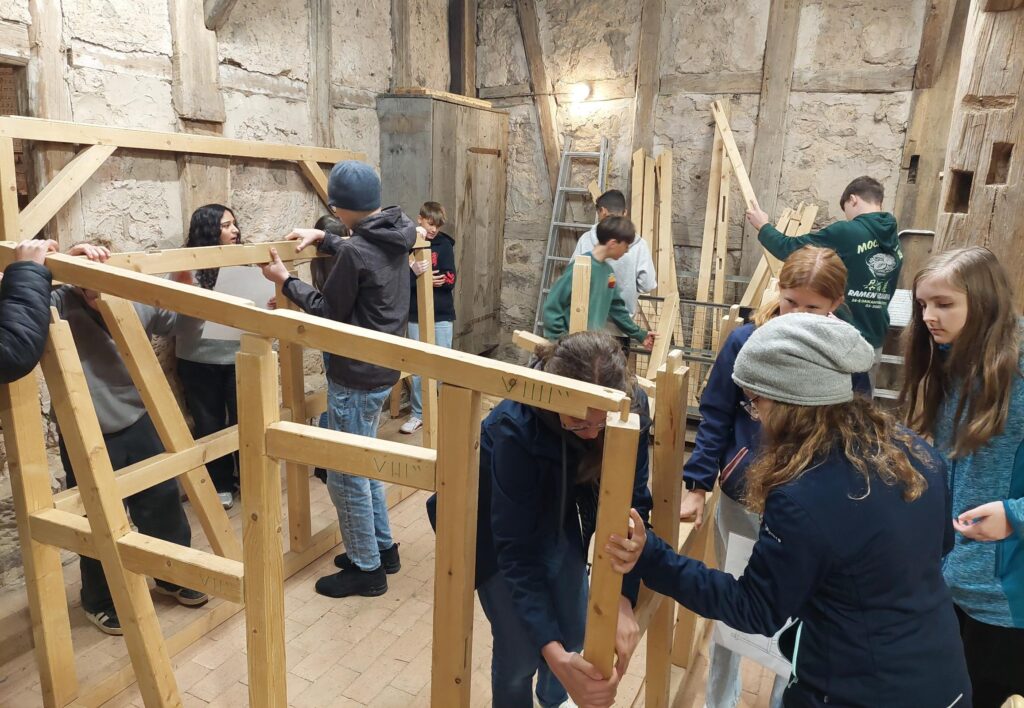 „Die Schüle­rin­nen und Schüler erler­nen fundierte Kennt­nisse über die mittel­al­ter­li­che Bauweise, insbe­son­dere über Fachwerk, Dachkon­struk­tio­nen und verwen­dete Materia­lien. Darüber hinaus setzen sie sich mit jüdischen Bräuchen sowie mit der Geschichte und Bedeu­tung der jüdischen Gemeinde in Rothen­burg  ausein­an­der. Ein weite­rer Schwer­punkt liegt auf dem Denkmal­schutz und der Bedeu­tung histo­ri­scher Bauwerke für das kultu­relle Erbe. Ergän­zend erhal­ten die Lernen­den Einbli­cke in das mittel­al­ter­li­che Leben und erfah­ren, was es bedeu­tet, in einem denkmal­ge­schütz­ten Haus zu leben.“