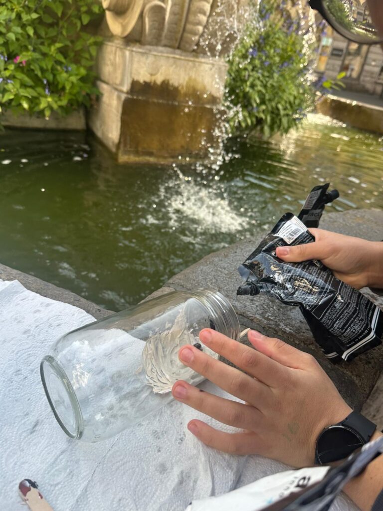 Die 9. Klasse bei ihrer ersten Exkursion zum Vierröhrenbrunnen ...