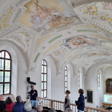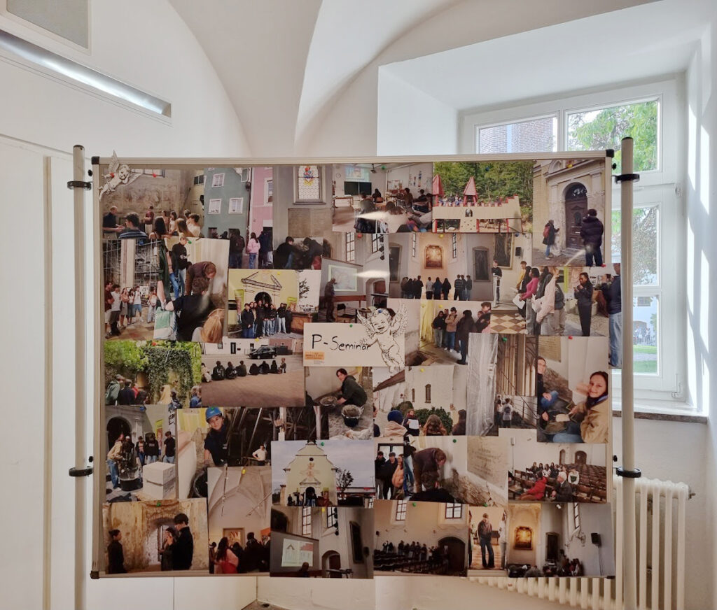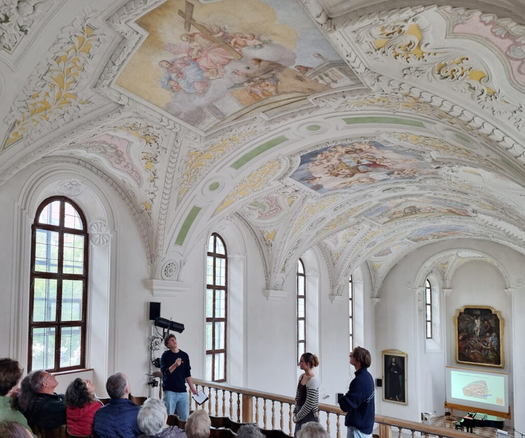 Das Landshuter Carossa-Gymnasium ist seit dem 19. Jahrhundert im ehemaligen Franziskanerkloster Heilig Kreuz beheimatet. In einem P-Seminar geht es ein Schuljahr lang um die einstige Klosterkirche, die von der Schule als Aula und von der Stadt als Konzertraum genutzt wird. In seiner langen Nutzungsgeschichte hat der Kirchenraum viele Eingriffe erlebt, seine Deckengemälde etwa waren 1807 zugetüncht worden und konnten nach und nach wieder freigelegt werden.