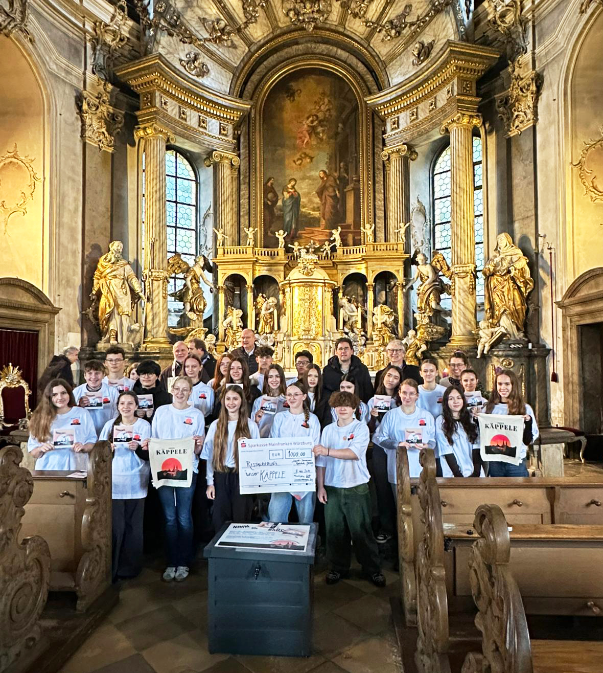 Den Erlös dieser Veranstaltung, die 600 Menschen anziehen konnte, haben die Jugendlichen nun für die Instandsetzung der Wallfahrtskirche gespendet: Am 8. Dezember 2025 überreichte die damalige 8e, heute 9e einen 1.000-€-Spendenscheck für die Restaurierungsarbeiten am Würzburger Käppele – erwirtschaftet aus den Einnahmen ihrer eigenen Veranstaltung am Wallfahrtsort.
